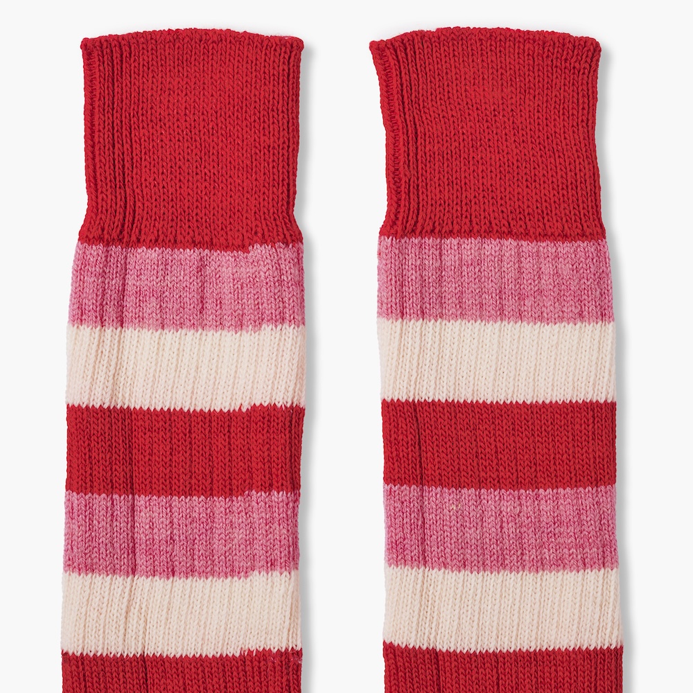 The socks are a traditional hooped style in mid pink, light pink and red British wool that is ribbed to help shape to your foot. The toe and heels are reinforced for extra comfort and durability so that your socks last as long as my love for Scott McTominay, which is obviously eternal.