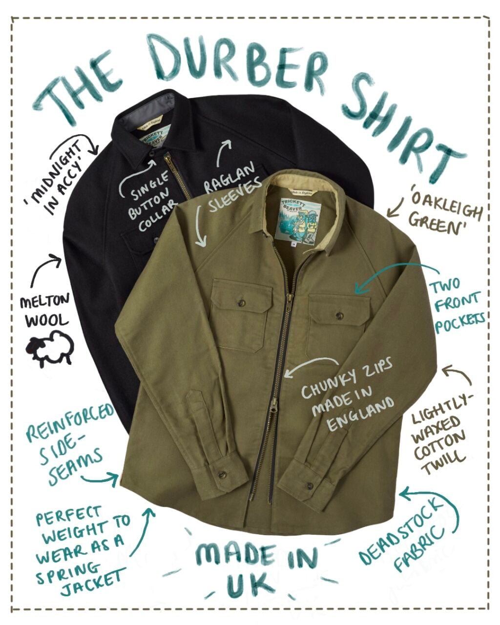 The Durber shirt is entirely made in this country and when I say entirely I really do mean it, even the thread that was used to sew this garment together was made in the UK, that is just how dedicated I am to the cause. So, as with all wonderful clothes, let’s start with the fabric. This is a 100% melton wool that is probably heavier than most of the coats that you have hanging up in your wardrobe. It has a super soft handle, but feels robust at the same time, it is a bit confusing, but in a good way… like me. The colour is ‘Midnight in Accy’, which to normal people means a super dark navy blue, you can call it black if you are a super chic French model that wears only black, but I promise it is a SUPER dark navy blue.