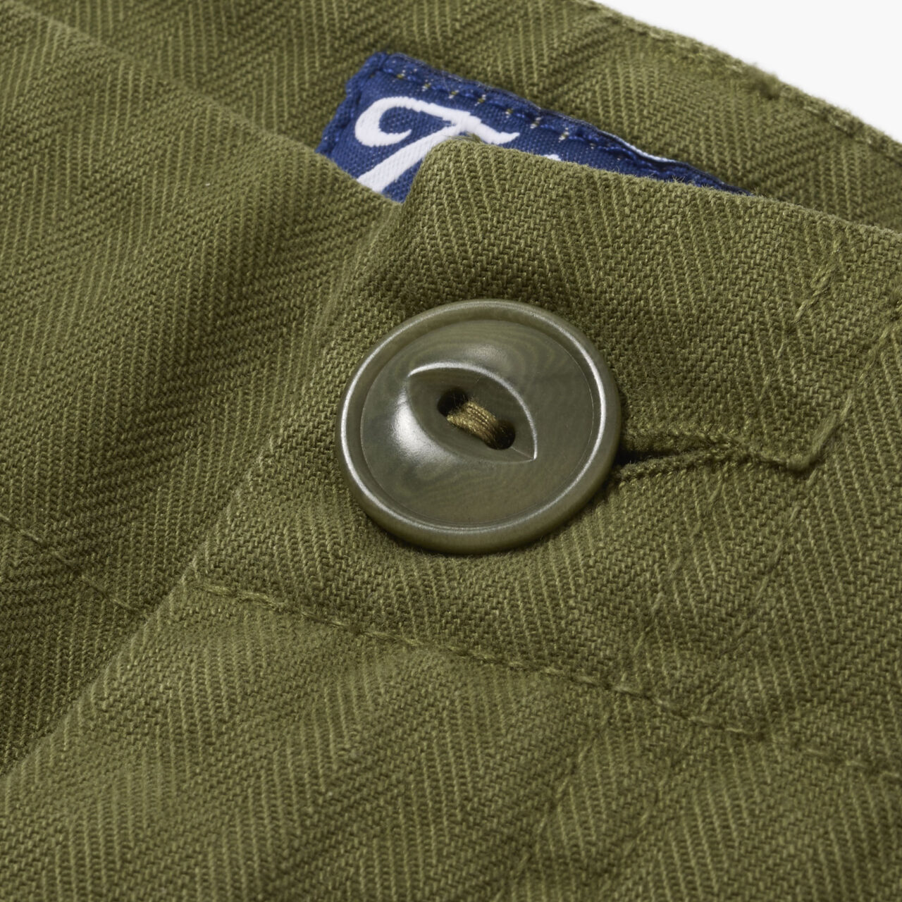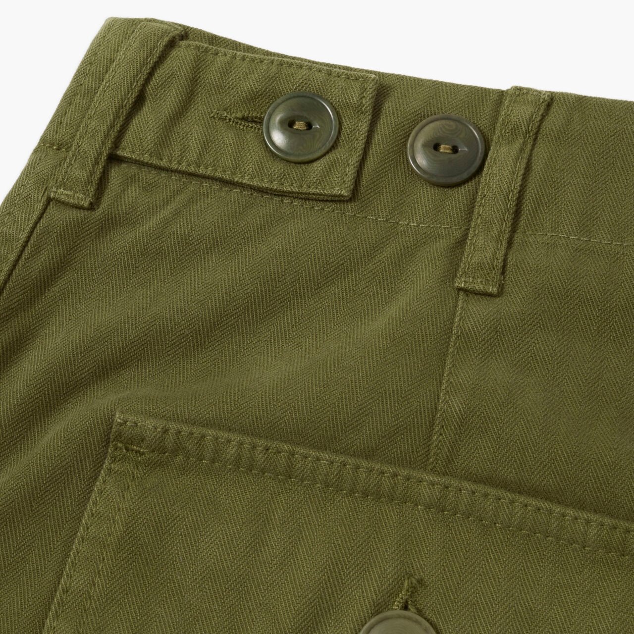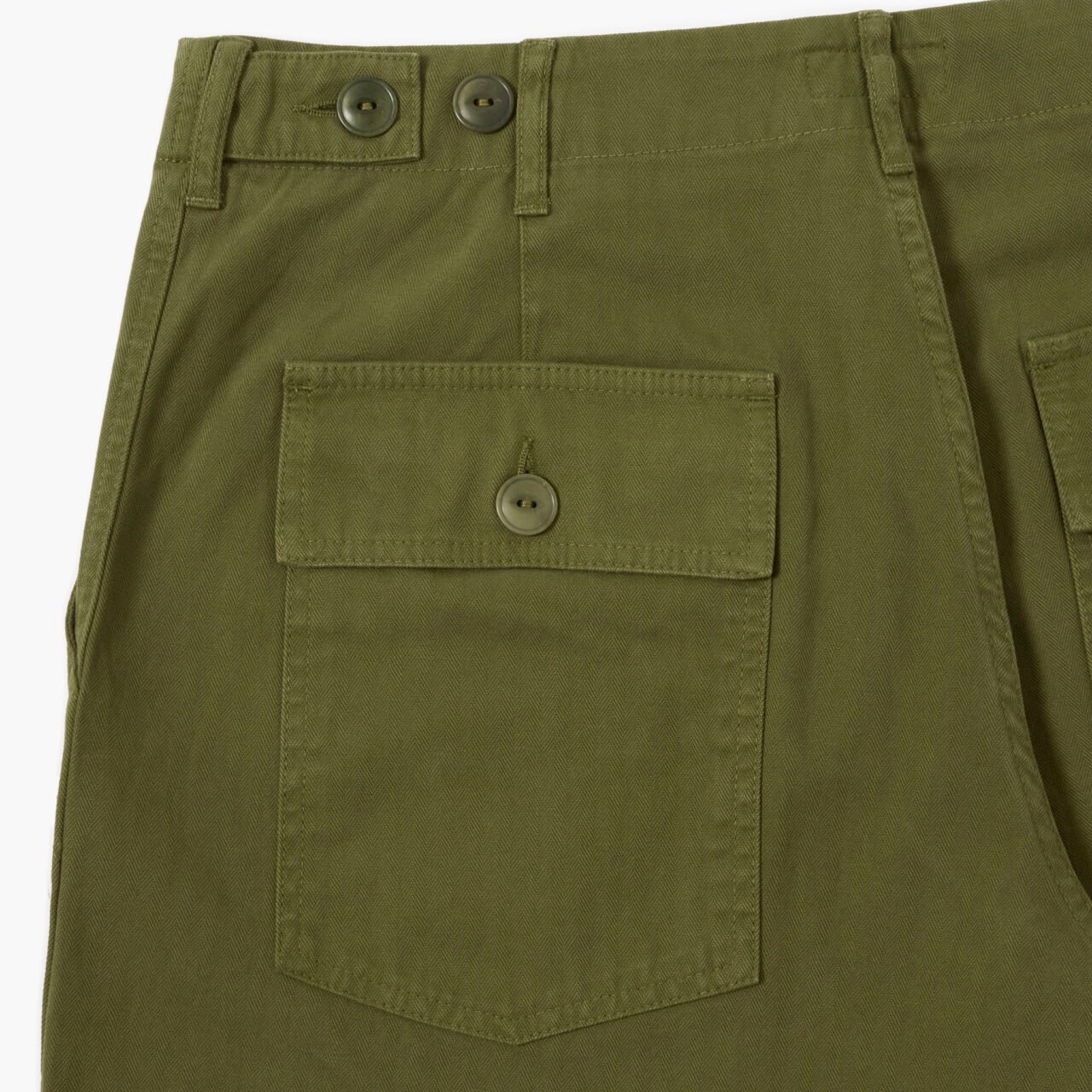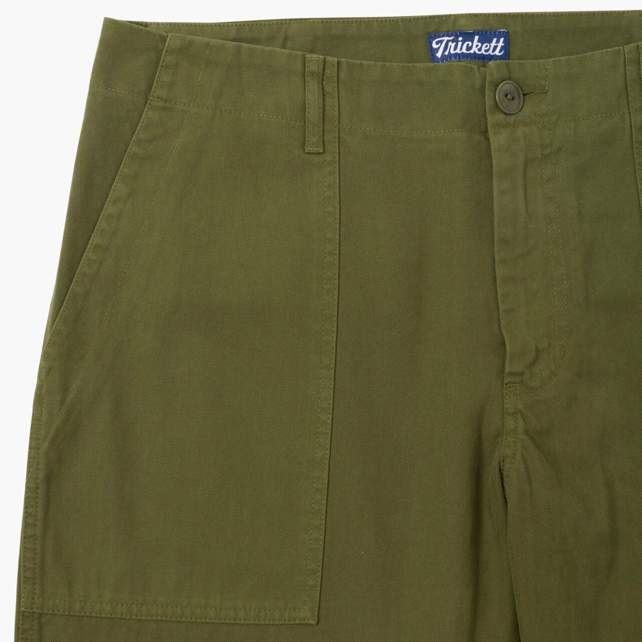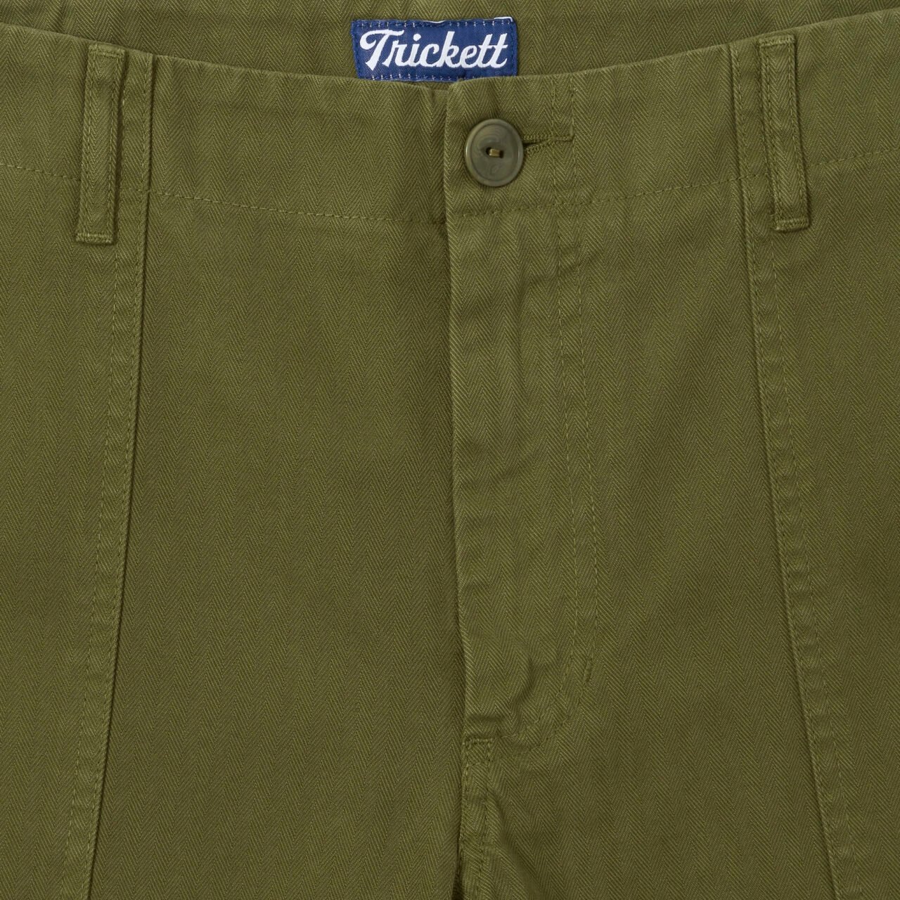 I have always wanted a pair of fatigues that look like the original ‘jungle greens’, but feel a bit more like a modern-day pair of trousers and to be quite honest with you, I think we have managed it. We always start off with the fabric and this one is a little bit special. This is a beautiful brushed, mid-weight herringbone twill that will just improve with washing. I have had my samples for a while and they seem to get better and better, which is a textbook sign of a great pair of TRiCKETT trousers. The colour is as close to the original deadstock colour that we could find, but they wash down a treat and end up being a few shades lighter after about 10 washes.