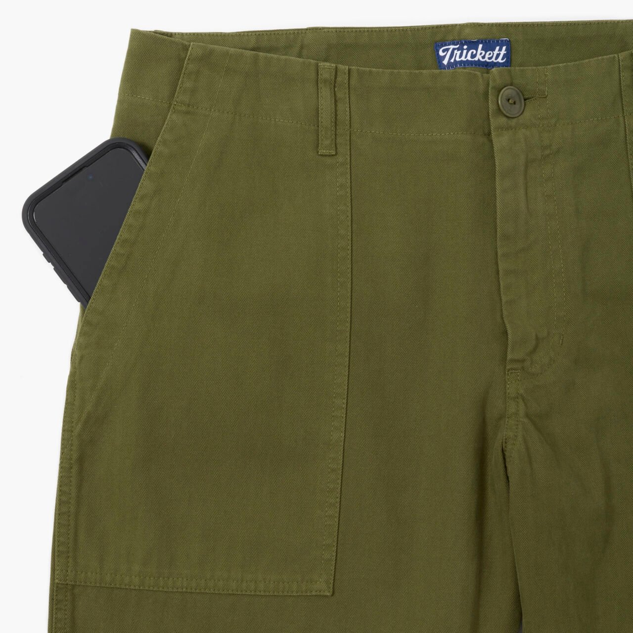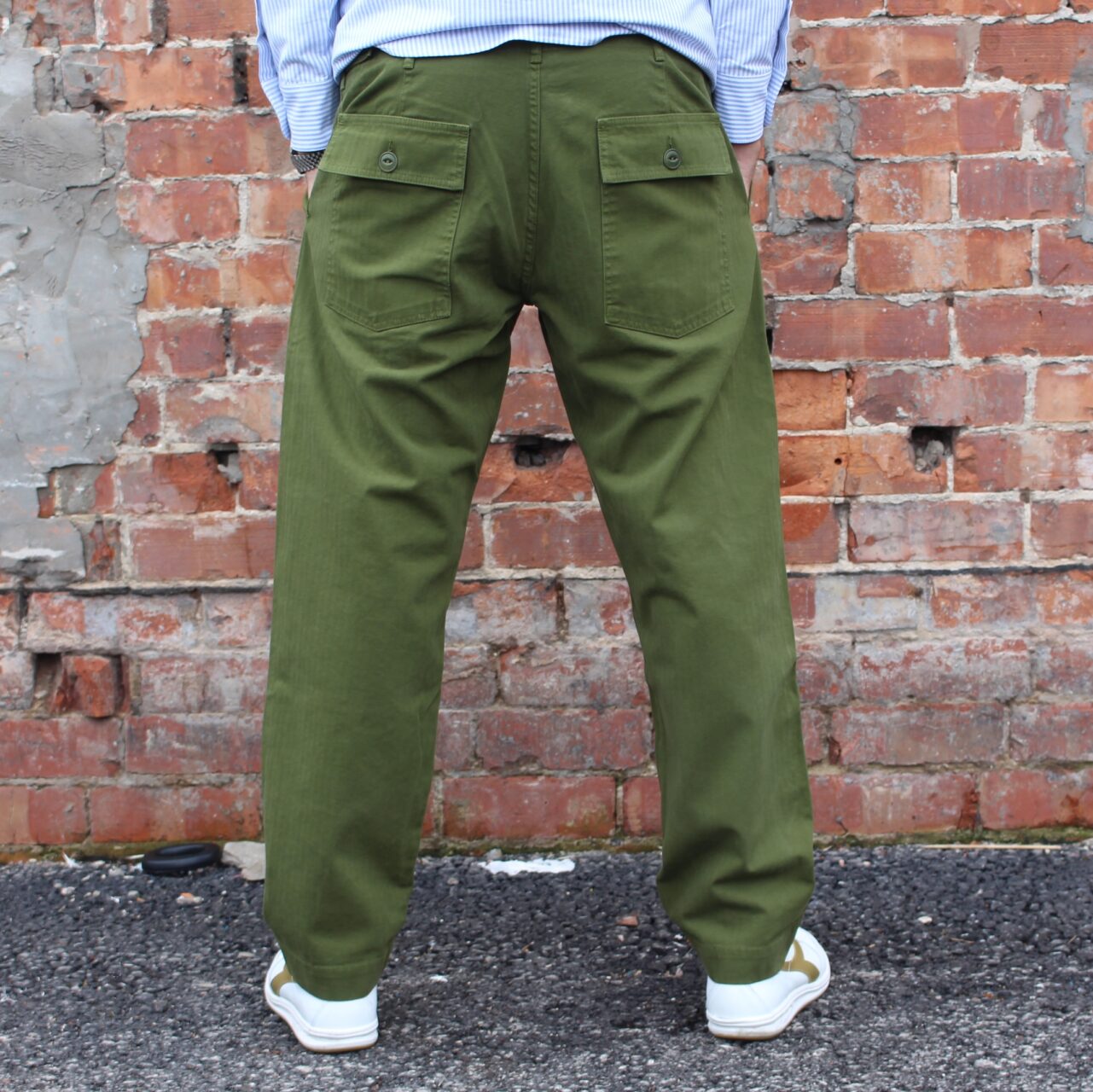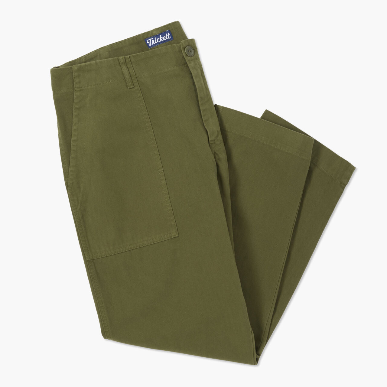 At the front, there are two fatigue-style patch pockets that are big enough for phones, keys and whatever else you want to store in there to pretend to be a soldier. The trousers are loose through the thigh with a lovely tapered hem. If you have a pair of our Porto trousers, they fit in exactly the same way. At the back, there are two flapped patch pockets with a button fastening, again exactly like the originals had, because here at TRiCKETT we are all about keeping things as true to the originals as possible.