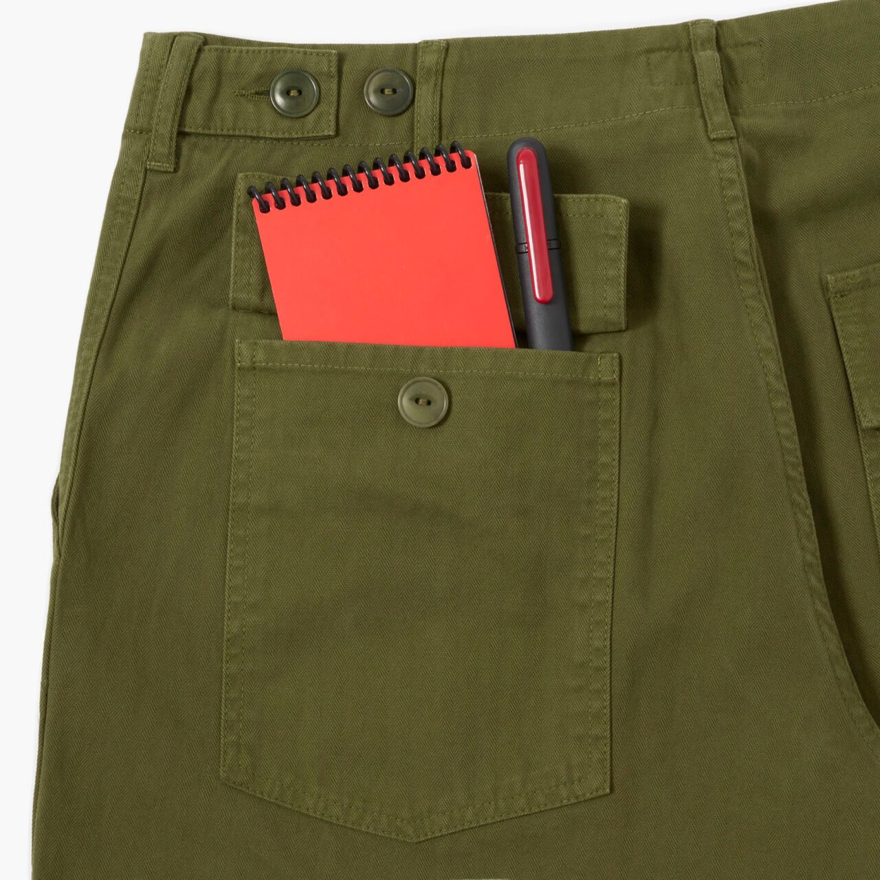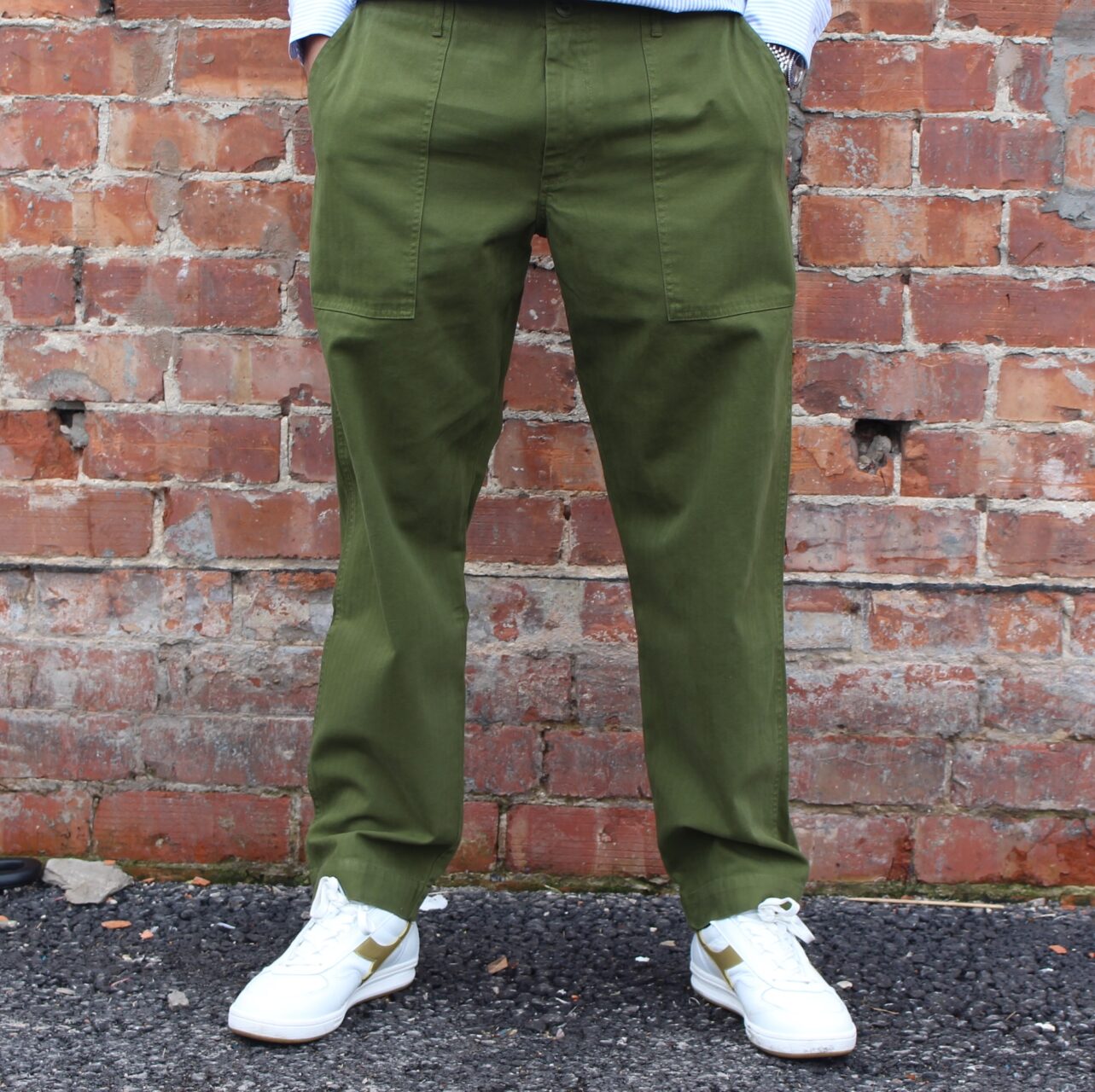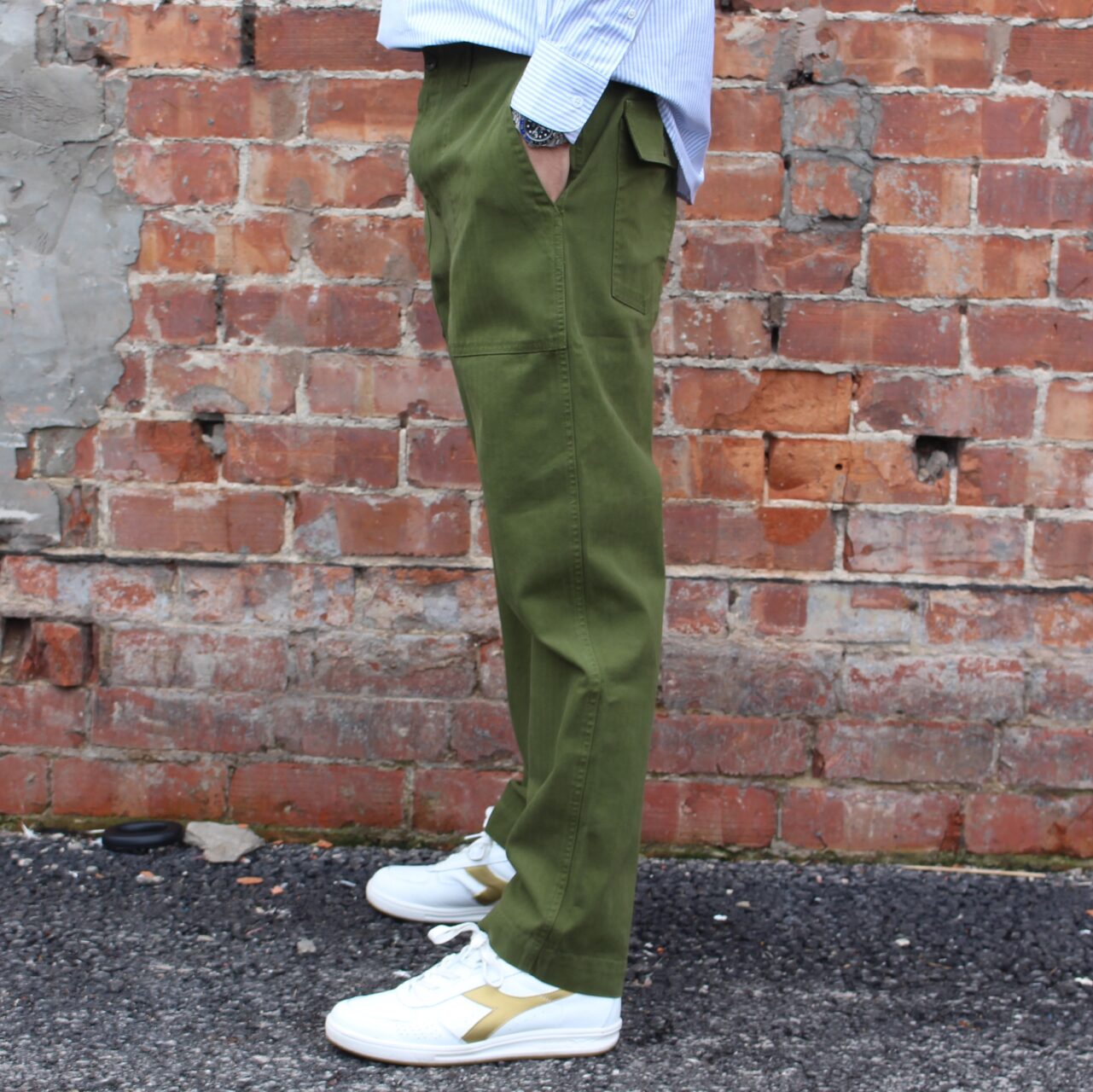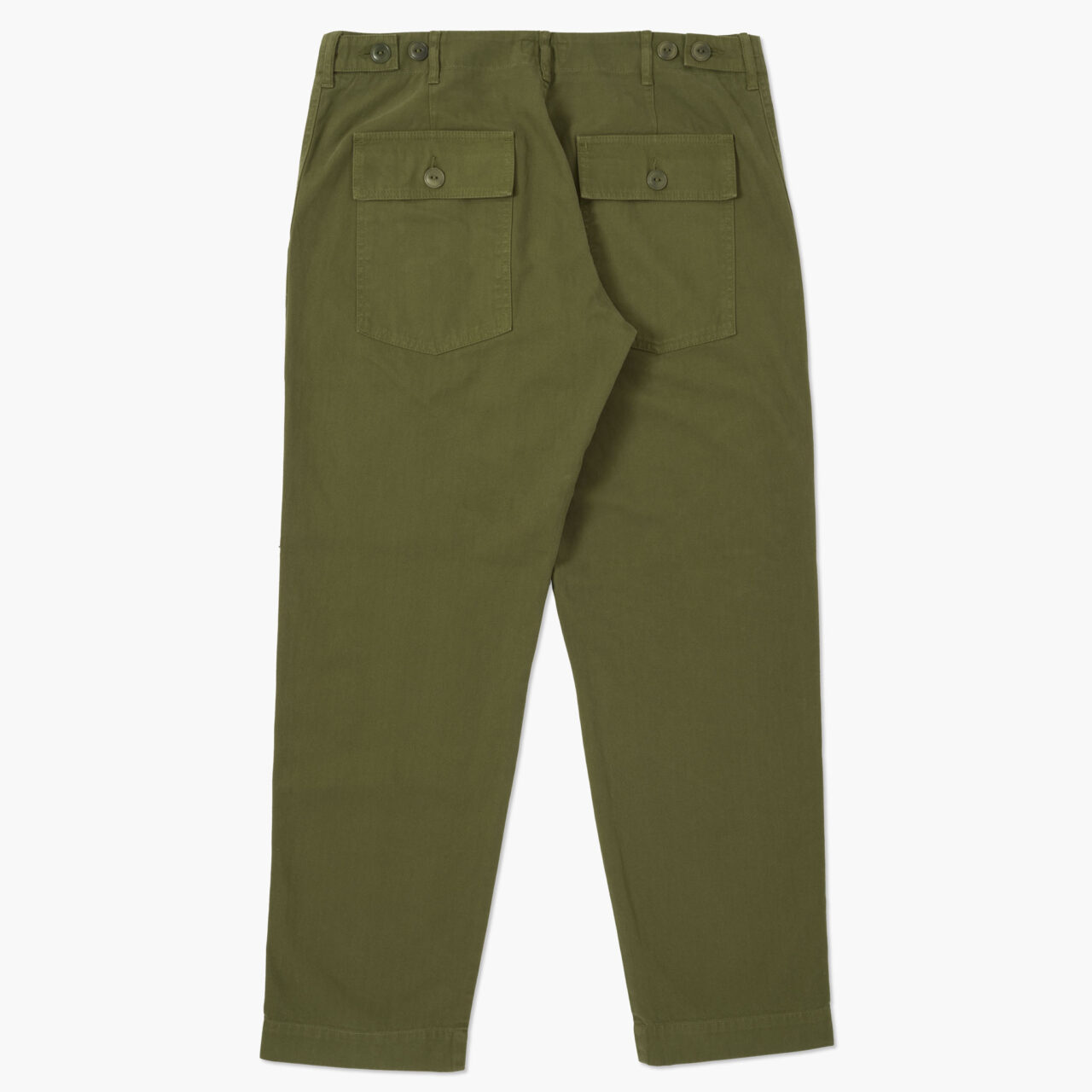 At the front, there are two fatigue-style patch pockets that are big enough for phones, keys and whatever else you want to store in there to pretend to be a soldier. The trousers are loose through the thigh with a lovely tapered hem. If you have a pair of our Porto trousers, they fit in exactly the same way. At the back, there are two flapped patch pockets with a button fastening, again exactly like the originals had, because here at TRiCKETT we are all about keeping things as true to the originals as possible.