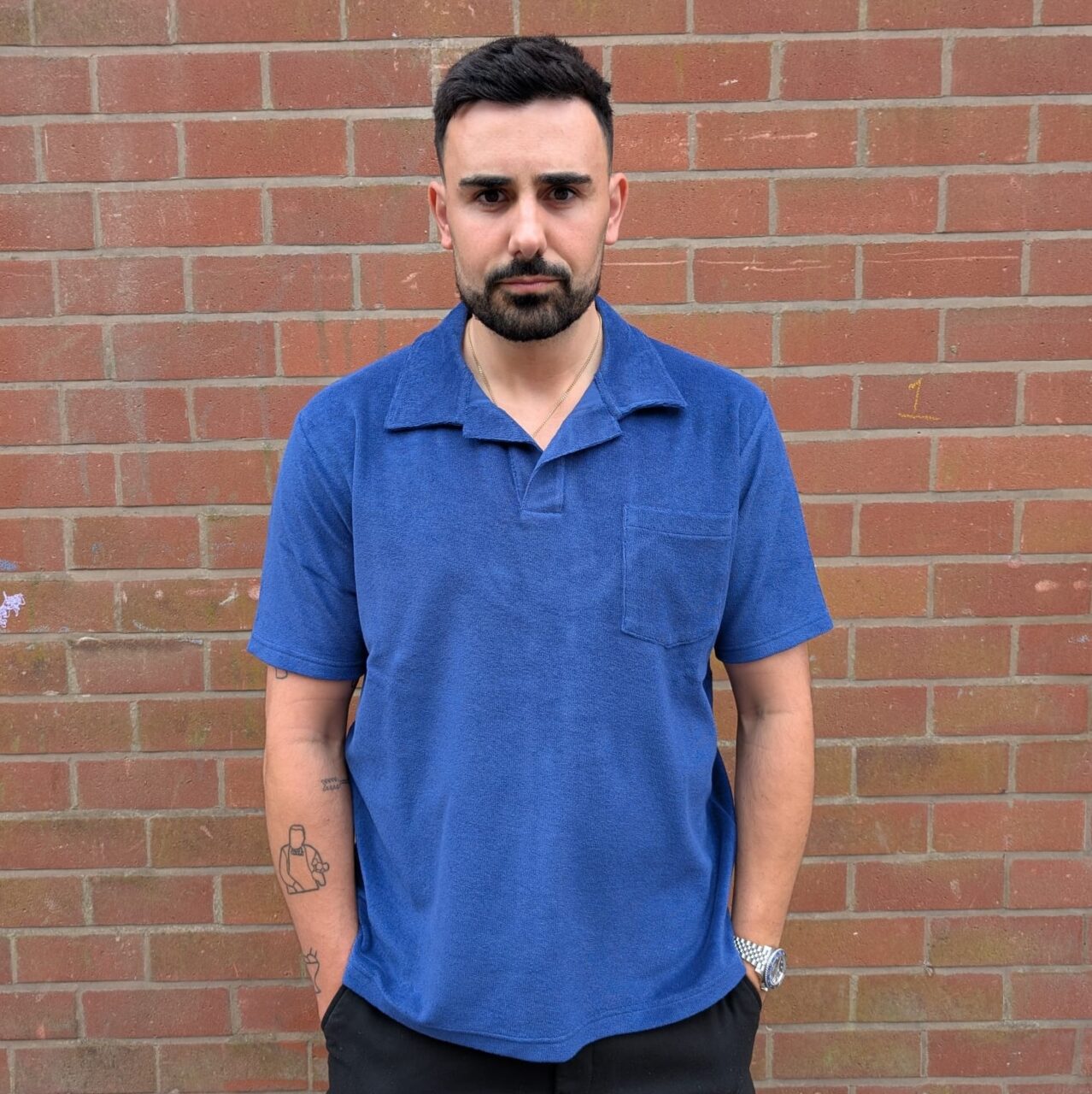 The fit is relaxed but by no means baggy. Luca (who usually wears a medium) has gone up a size to make the polo look extra flowy and summery, but if you go for your normal size it will fit a treat. There is a split side seam for extra mobility, a pocket for storing and losing your train tickets and an open ‘camp’ style collar without a button so that you can show off your chest and get a bit of air circulating.