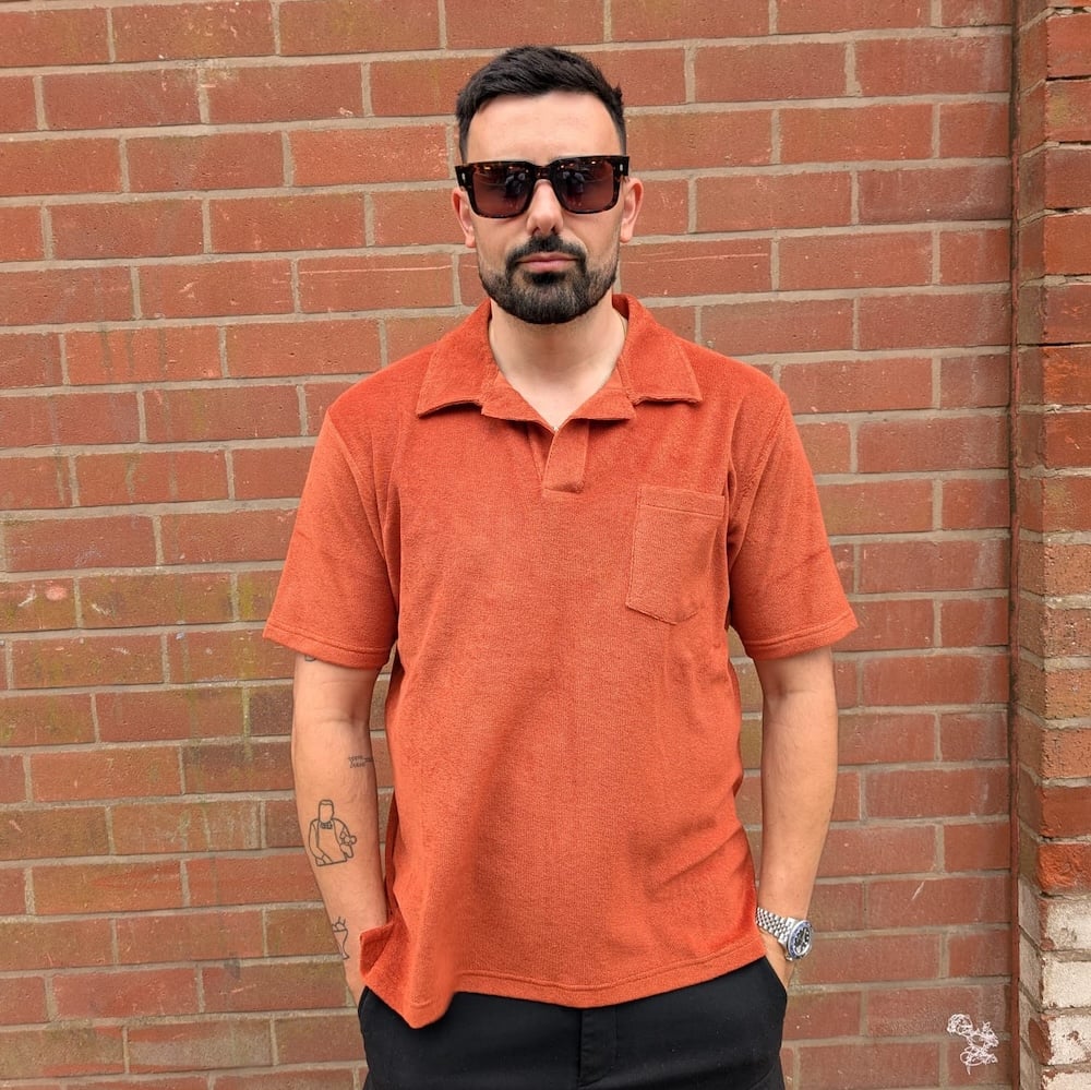 The fit is relaxed but by no means baggy. Luca (who usually wears a medium) has gone up a size to make the polo look extra flowy and summery, but if you go for your normal size it will fit a treat. There is a split side seam for extra mobility, a pocket for storing and losing your train tickets and an open ‘camp’ style collar without a button so that you can show off your chest and get a bit of air circulating.