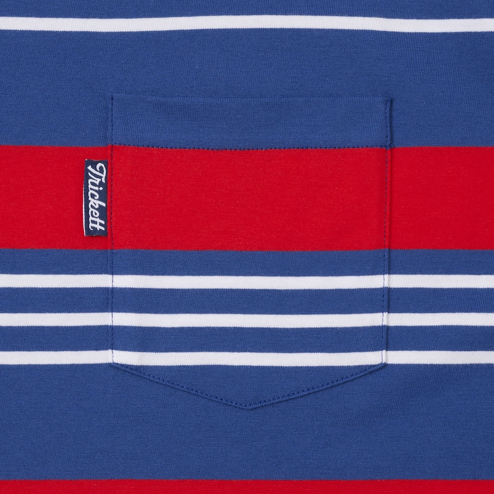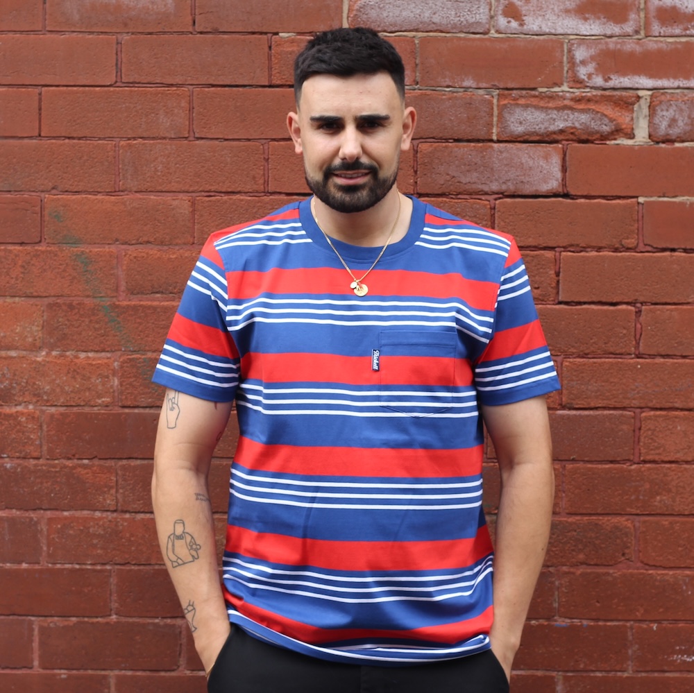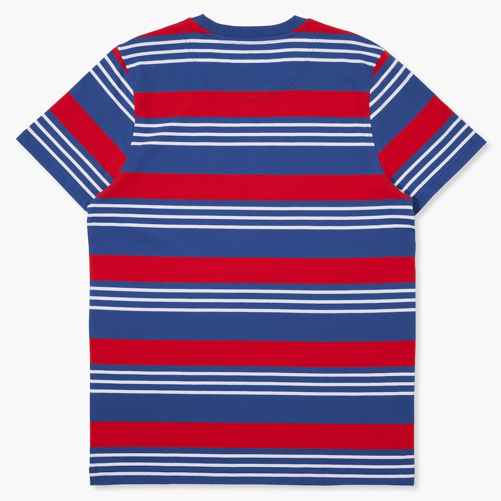 A repeating pattern of the bold red stripe with the three thinner stripes underneath emulating the iconic shirt worn in 1998. We even colour-matched the colours from the original shirt, just because we are that fanatical about this shirt. If you don’t care about football and just like nice t-shirts, royal blue, white and red always look pretty spectacular together.
